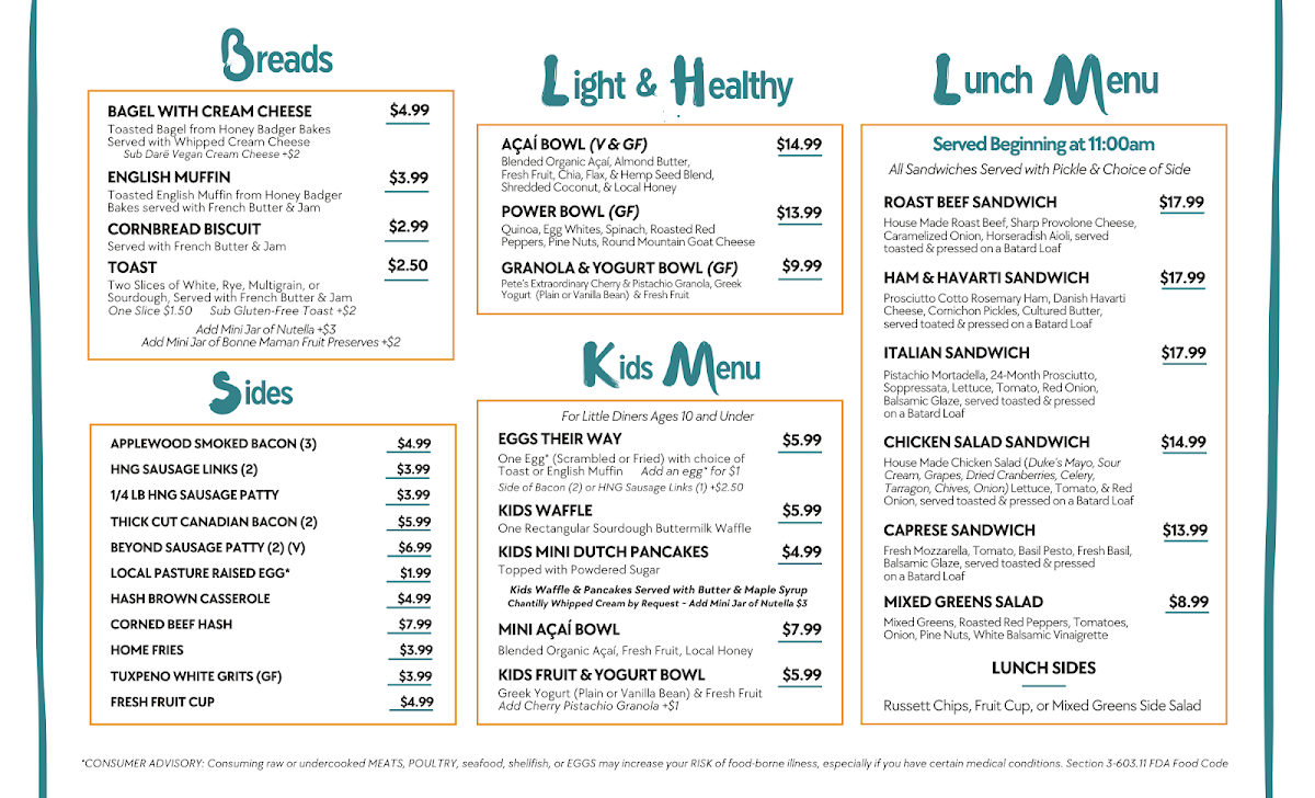 Breakfast, served from Wednesday to Sunday, features classics like "Eggs Your Way" alongside a hearty House Made Corned Beef Hash, ensuring that every palate is satisfied. The breakfast dishes are complemented by comforting sides such as hash brown casserole and fruit.